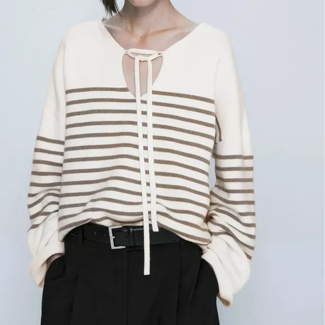 The wide stripes bring a modern twist to this classic knitwear piece. The pattern is both bold and timeless, making it easy to pair with other spring essentials. The O-neck collar adds a simple but elegant detail that enhances the overall chic aesthetic of the top.